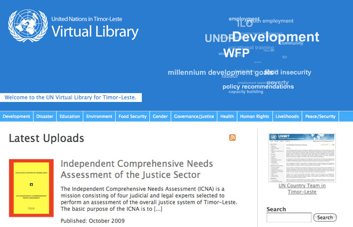 While working for the United Nations Resident Coordinator’s office in Timor-Leste, I was asked to put together a virtual library so that all the UN’s publications from Timor-Leste could be accessed online. At the time there was no systematic organization of the UN’s publications in an easy place to find. The virtual library was built using WordPress and featured tags and categories to organize the publications.
