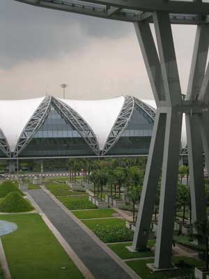 So have you heard? Bangkok has a new international airport called Suvarnabhumi… actually the airport is not in Bangkok anymore – it's in the next province to the southeast called Samut Prakan. The airport is definitely much more modern than the old Don Mueang with high ceilings, a minimalist German industrial design, and lots more natural lighting… BUT it's still very thai in the way that things operate. You won't really get a sense of it departing, but arriving to the new airport will be pretty much similar to the old airport (i.e. cramped space and confusion – Thai's still haven't figured out that LARGE signs and maps are really important in directing people where to go). Maybe this arrival section is just a taste to prepare the tourists coming to Bangkok of the craziness that they'll find in the city, a short 1-hour bus ride… don't worry a subway is in the works.